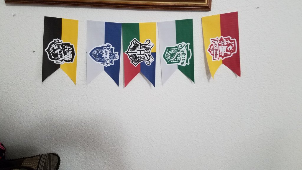 So, in an effort to make stay-at-home school fun, and supplement the work provided, I recreated Hogwarts at home, complete with themed books, wands, and house banners. Mind you it was low budget and minimal decor, but it worked… for most of the 2 weeks.